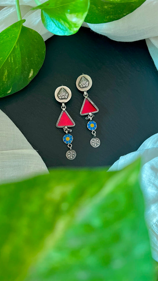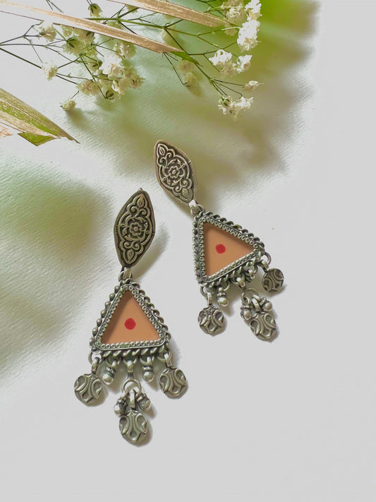 "Jeevika": Graceful orange Hand-painted earrings with versatile silver hangings with tribal patterns