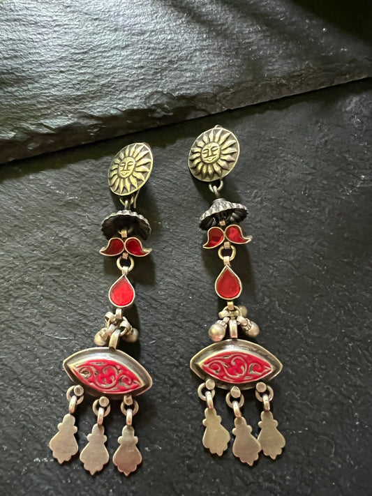 Pushti : exciting red long glass silver fusion earrings